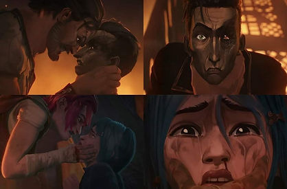 A similar strategy is employed at the end of this episode, though it isn't as immediately noticeable. Throughout the entirety of the first arc of Arcane, Vander has warned Vi against taking aggressive actions, telling her that instead of solving things, it only causes more problems. When Vi learns that her sister had a part in the tragic events that unfolded, the camera shows us that Vi has in fact become the monster that Vander had consistently warned her about. The way Vi grabs Powder's face is a direct parallel to the way that Vander choked Silco. And as we get to see the close up on Powder's face, we are able to understand that as Silco had been betrayed by his "brother" in the past, Powder feels that same betrayal from her sister.